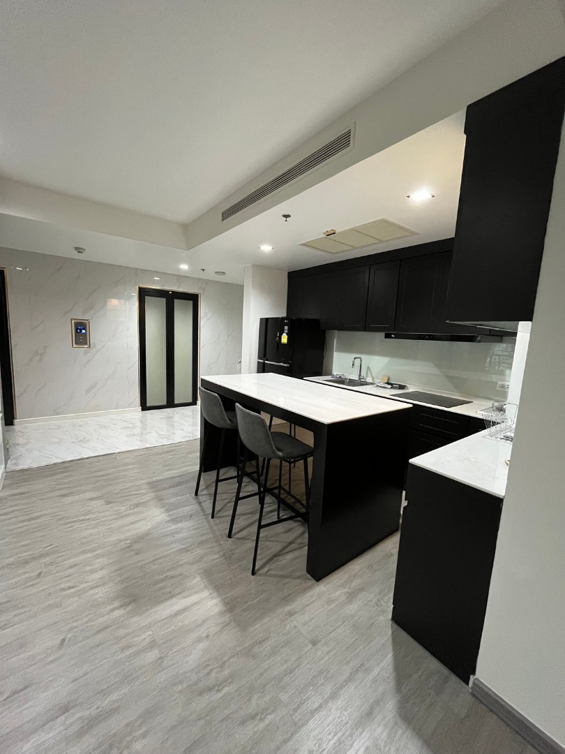 Kitchen with 3-burner induction hob, safe for use, comes with a large island table.